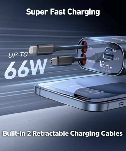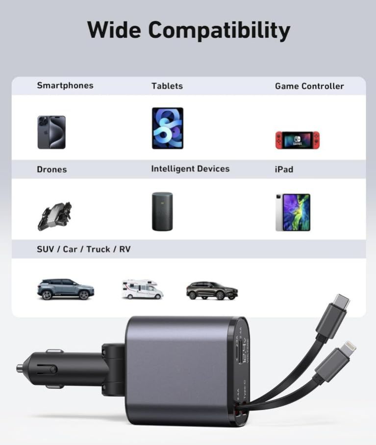 - 【Smart Fast Car Charger】This Retractable Super Fast Car Charger made of high-quality chips ensures efficient and stable charging of your device that charges up to 4 devices simultaneously.