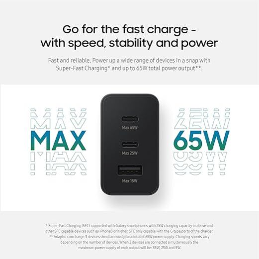 65W Samsug Trio Port Charger Adapter | Super Fast Type C to Type A Wall Adaptor Compatible with Samsung Galaxy S24 Ultra/S24 plus/S24/S23 ultra/S23/S23 fe/S22/S21/A55/F55/M55/Z fold/flip/5/4/3, Black