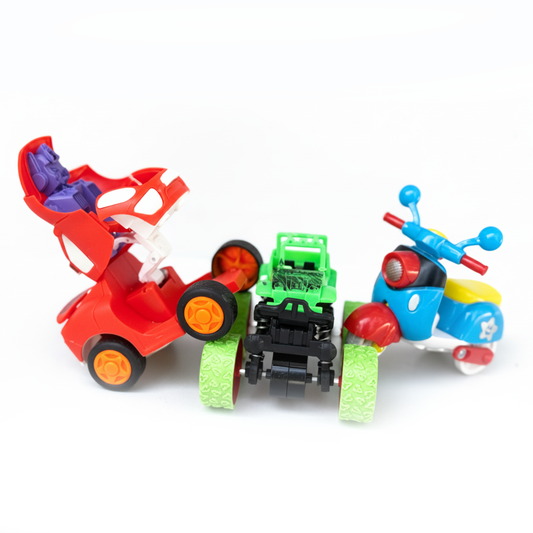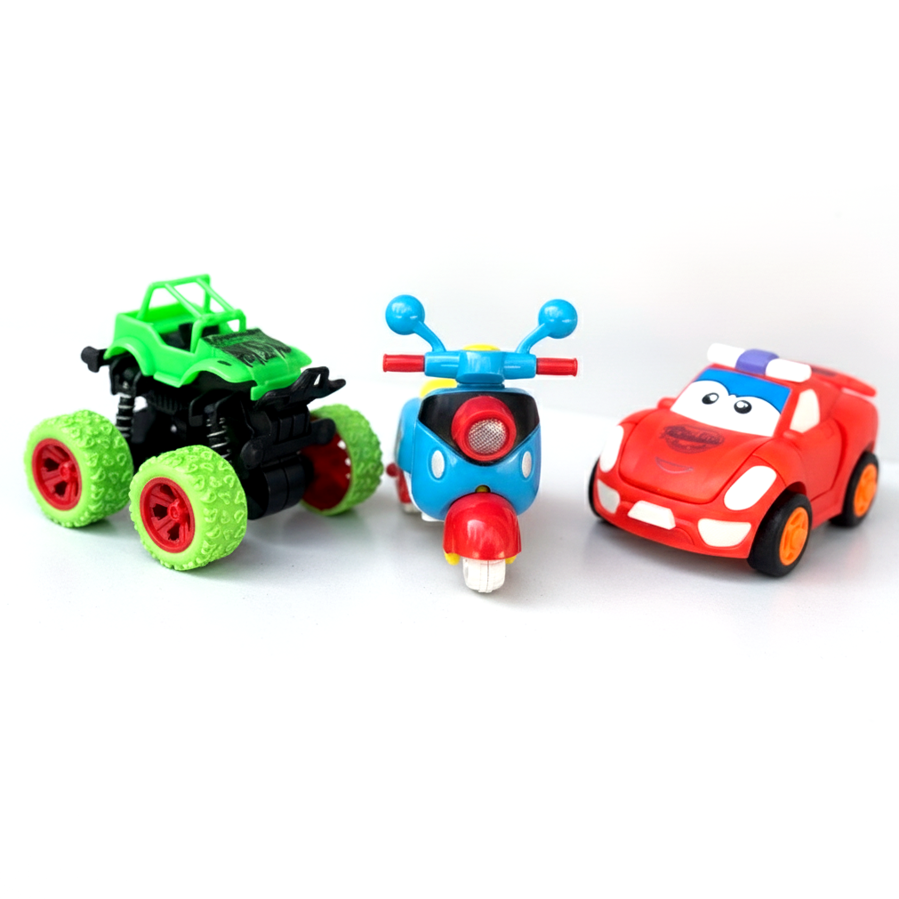 Set of multicolor plastic toy vehicles designed specifically for young children, featuring a stroller car, a monster truck, and a ride-on scooter. Each vehicle is crafted with smooth edges and durable plastic, offering safety and resistance to tough play while being lightweight and easy for small hands to manipulate.